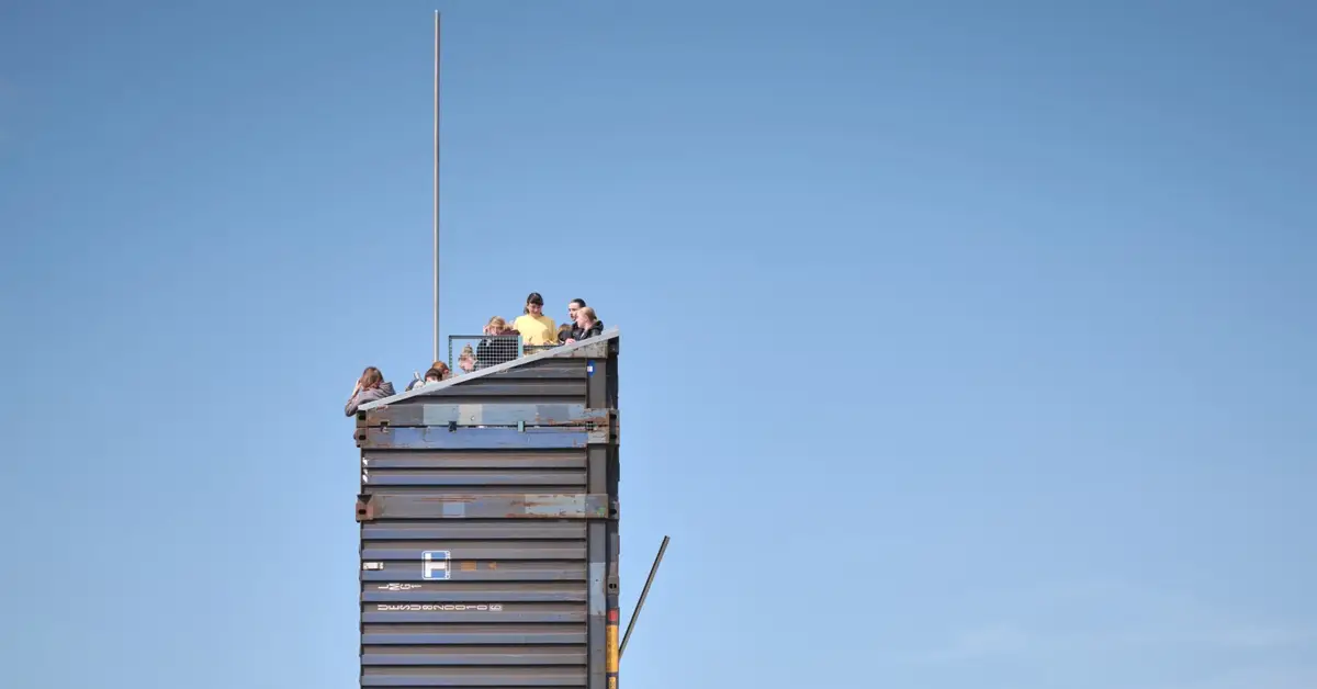 - One container lies horizontally to form a viewing deck; the other stands vertically as the tower’s core.