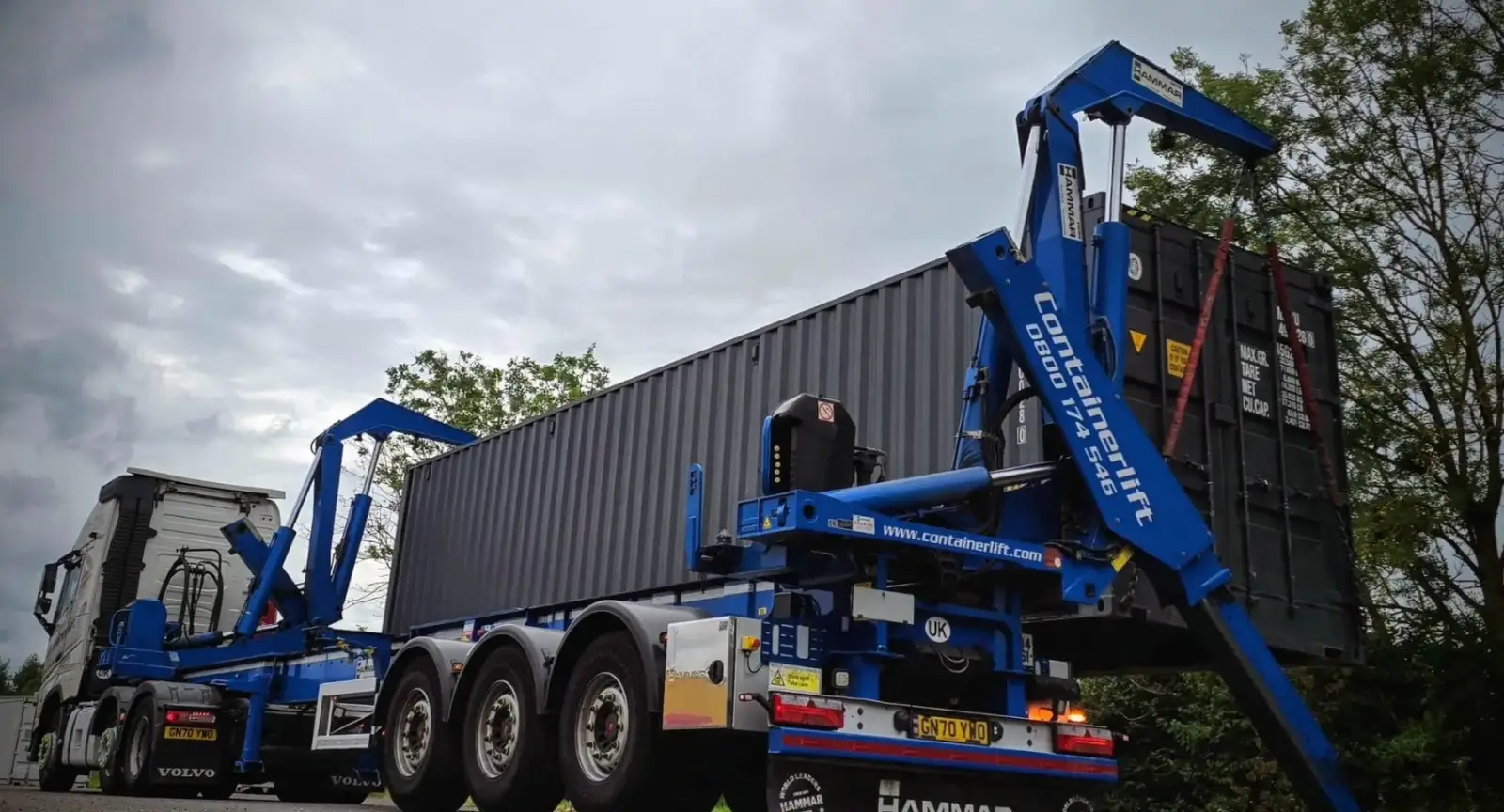 Self-loading vehicles, like the Hammar sidelifters used by Containerlift, feature hydraulic lifting arms mounted on the truck’s chassis. These arms can extend outwards, lift a fully loaded shipping container (up to 36 tonnes), and set it down at your chosen spot. Once positioned, the container sits at ground level—ideal for loading, unloading, or long-term storage.